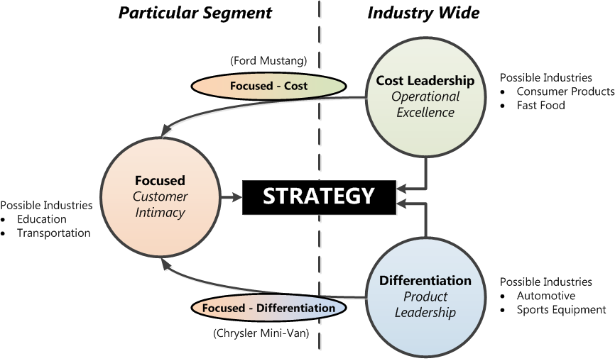 - "Focused Differentiation": Here the organization seeks a product differentiation advantage within a particular customer segment as opposed to an industry wide group.