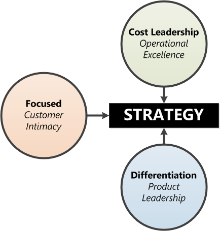 There are three primary strategies available to an organization in order to achieve competitive advantage: Cost Leadership, Differentiation, and Focused.